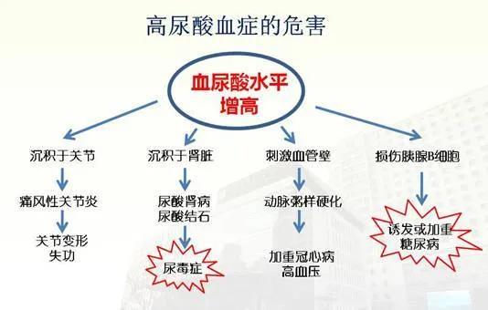Après l'hypertension artérielle, l'hypercholestérolémie, le diabète et la goutte, directement liés à l'hyperacidité urique sanguine, également connue sous le nom de "quatrième hyperactivité", jusqu'à six ans d'hyperacidité urique, de nouveaux symptômes devraient apparaître, ou des lésions précoces des organes du corps, sans qu'il y ait eu d'alerte. Mais les dommages sont fatals, et l'acide urique doit être réduit.