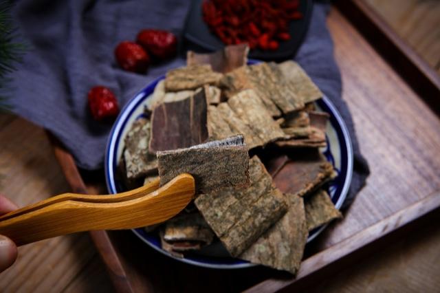 Cortex Eucommiae, l'écorce de l'arbre Cortex Eucommiae, famille des Eucommiaceae, est de nature chaude et de goût sucré, et appartient aux méridiens du foie et des reins, Effets : tonification des reins et du yang, renforcement des muscles et des os, soulagement de la douleur et stabilisation du fœtus.