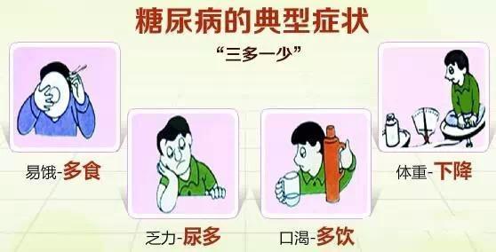 Les symptômes du diabète peuvent être divisés en deux catégories : une catégorie est liée aux troubles métaboliques, en particulier à l'hyperglycémie liée aux "trois plus et un moins", se référant à la polydipsie, la polyphagie et l'émaciation, principalement observée dans le diabète sucré de type 1, le diabète sucré de type 2 n'est généralement pas évident ou seulement certaines des performances du patient, et l'apparition du diabète sucré de type 2 avant l'apparition de l'obésité est souvent trouvée, si non obtenir. Si le diabète sucré de type 2 n'est pas diagnostiqué à temps, la perte de poids sera progressive ; une autre catégorie importante est une variété de complications aiguës et chroniques, telles que l'acidocétose diabétique, le coma diabétique hyperosmolaire non cétosique, l'acidose lactique diabétique, les infections cutanées diabétiques, le pied diabétique.