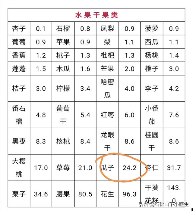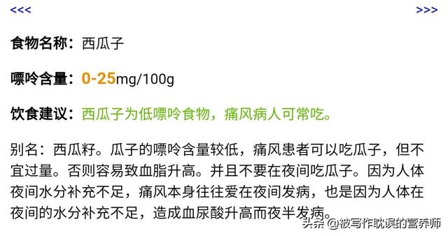 Les graines de melon, l'ingrédient mentionné par l'auteur de la question, peuvent-elles être consommées par les personnes souffrant d'hyperuricémie ? En fait, si l'on considère uniquement la teneur en purines des graines de melon, on peut dire qu'il s'agit d'un ingrédient très intéressant.Deux taels de graines de melon contiennent environ 24 milligrammes de purine.appartenirFaible teneur en purineLes ingrédients conviennent mieux aux personnes souffrant de goutte ou d'hyperuricémie.Le tableau ci-dessous indique la teneur en purines de certains ingrédients courants de la catégorie des fruits secs.Il s'agit du dernier tableau pour 2019, si vous êtes intéressé, vous pouvez l'étudier.