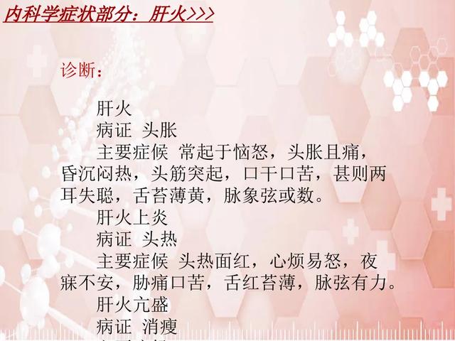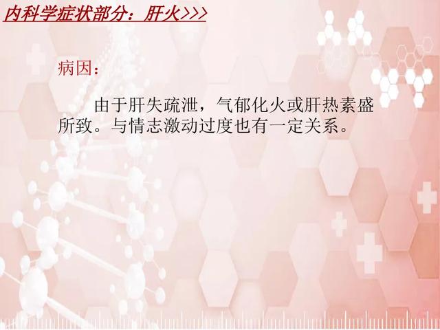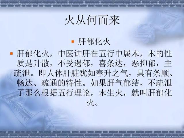 Le foie a pour rôle de réguler le fonctionnement du qi et du sang du corps, notamment de réguler les émotions, de sécréter la bile et d'aider à la digestion. Le feu du foie est un déséquilibre du qi et du sang dans le foie, le qi du foie montant en flèche après la colère, le qi est yang, le qi yang est chaud lorsqu'il est plein de chaleur, et les maux de la chaleur s'accumulent dans le foie comme principaux changements pathologiques, résumant les symptômes du feu du foie comme suitLe qi et le sang du foie sont stagnants et indisciplinés + le feu est abondant et blesse les liquides organiques, doncInduit une réponse symptomatique systémique.