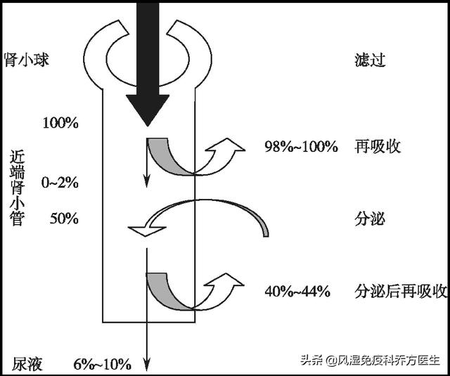 La réduction de l'excrétion rénale de l'acide urique est un facteur important dans le développement de l'hyperuricémie, y compris la réduction de la filtration glomérulaire de l'acide urique, l'augmentation de la réabsorption tubulaire et la réduction de la sécrétion tubulaire de l'acide urique. Des études antérieures ont conclu que la formation de l'hyperuricémie était principalement due à une réduction de la sécrétion tubulaire rénale. Des études récentes ont montré que l'augmentation de la réabsorption tubulaire de l'urate joue également un rôle important.