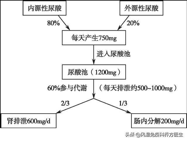 Des études par traceurs radionucléides ont montré que le pool normal d'acide urique dans l'organisme est en moyenne de 1 200 mg, produisant environ 750 mg par jour et rejetant 500 à 1 000 mg par jour, avec environ 2/3 excrétés par l'urine et l'autre 1/3 rejeté par les intestins ou décomposé par les oxydases bactériennes de l'acide urique dans le tractus intestinal.
