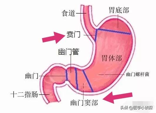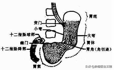 Les aliments provenant de l'œsophage sont temporairement stockés dans l'estomac, partiellement digérés, puis envoyés dans le duodénum après un certain temps, et l'estomac a également une fonction de sécrétion endocrine. L'estomac est généralement divisé en quatre parties : la partie proche du cardia est appelée partie cardia, et la limite n'est pas évidente ; au-dessus du plan du cardia, la partie qui s'étend en haut à gauche est appelée fundus ; du fundus de l'estomac jusqu'au milieu de l'échancrure angulaire, elle est appelée corps de l'estomac ; entre le corps de l'estomac et le pylore, elle est appelée partie pylore. L'antre gastrique est situé à la partie la plus basse de la petite courbure de l'estomac et se connecte à la trappe pylorique. Elle est représentée sur la figure.