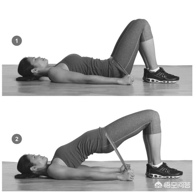1) S'allonger sur le dos. Placez la bande de résistance au-dessus de l'articulation de la hanche et tenez les extrémités de la bande des deux côtés avec les deux mains pour la fixer.