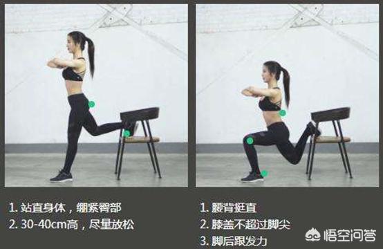 4, squat bulgare : placer la jambe arrière sur la chaise en s'accroupissant, le centre de gravité se trouvant dans le talon du pied avant, pour éviter que les articulations du genou ne se déforment et que les orteils ne soient dépassés. 10 par groupe, 3 groupes.