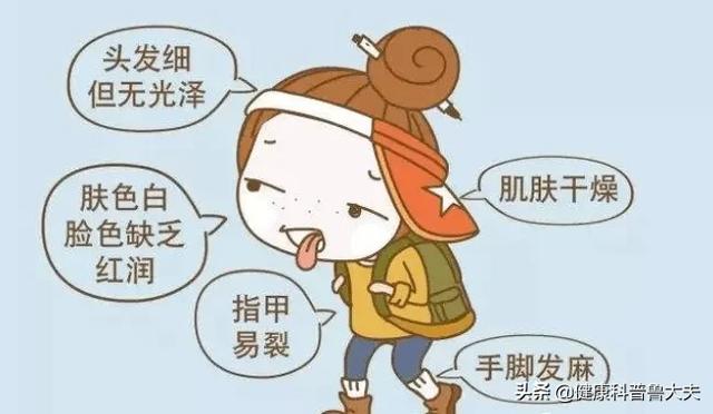 Par exemple, visage pâle ou jaunâtre, cheveux secs, peau sèche, lèvres pâles, vertiges, insomnie, rêverie, irritabilité, facilité à se mettre en colère, flux menstruel des femmes, rose pâle, et même aménorrhée, telles sont les manifestations de la carence en sang, mais aussi, à des degrés divers, de la carence en rate, par exemple, refus de manger, obésité ou émaciation, selles molles, selles non formées, douleurs abdominales, froid et froid des membres et autres manifestations.