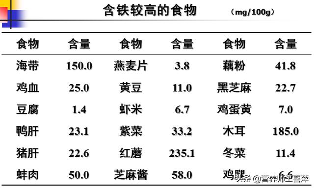 Dans la vie quotidienne, une carence en fer entraînant une anémie est fréquente. Outre les préparations complémentaires recommandées par le médecin, il convient d'accorder une plus grande attention à la supplémentation alimentaire. Les aliments d'origine animale, le sang d'animaux sains, le tofu, la viande maigre, le foie, etc. contenant du fer hémoglobine, sont des fer bivalents, faciles à absorber, avec un taux d'absorption de 15 à 25 %. Les aliments végétaux contenant beaucoup de fer, tels que les dattes, les épinards, etc., affectent l'absorption de nombreux facteurs, tels que l'acide phytique, l'acide ellagique et l'acide oxalique, et le taux d'absorption est faible, de l'ordre de 3 % seulement. Les aliments courants riches en fer sont énumérés ci-dessous :