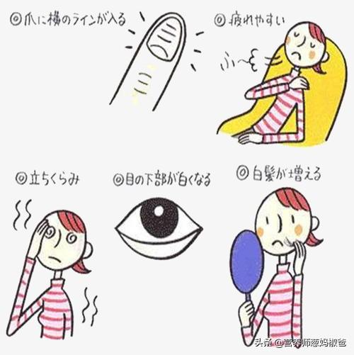 L'anémie se manifeste par une faiblesse mentale, une pâleur du visage, de la bouche et des lèvres, des vertiges, des acouphènes, des insomnies, des rêves, une neurasthénie, des pertes de mémoire, etc. En outre, la peau et les muqueuses sont également affectées : la peau est rugueuse et sans éclat.