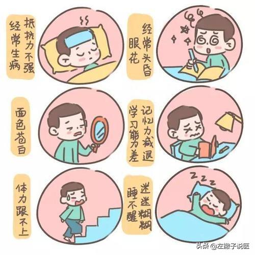 3) Vertiges, maux de tête, acouphènes, vision floue, manque de concentration, perte de mémoire, somnolence et rêves sont des symptômes courants. Ces symptômes sont dus à l'ischémie mais pas à l'oxygène. En cas d'anémie aiguë ou d'anémie sévère, les patients peuvent même présenter des symptômes d'évanouissement soudain ou de perte de conscience.