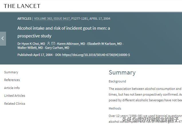 en ce qui concerneLes recherches sur l'alcool et la goutte sont assez nombreuses.Une étude de ce type, publiée dans The Lancet en 2004, a montré que l'intensité de la consommation d'alcool était également associée au risque de goutte :