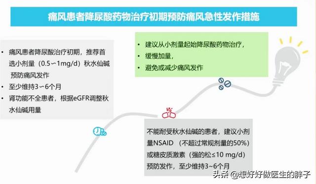 Et parce que les personnes qui souffrent de crises de goutte récurrentes après avoir pris des médicaments, qui sont laIl est conseillé aux personnes souffrant de douleurs dues aux cristaux dissolvants de toujours réduire de moitié la dose au tout début de leur traitement.Par exemple, si vous prenez du fébuxostat, commencez par 20 mg, afin que l'acide urique diminue plus lentement, et que le corps puisse s'adapter lentement à la diminution de l'acide urique, une réduction trop rapide de l'acide urique conduira facilement à des crises de goutte récurrentes. En outre, il est recommandé de prendre une petite dose orale de colchicine pour contrôler l'inflammation et réduire les risques de douleur liée à la lyse des cristaux, ou pour réduire les symptômes de la douleur liée à la lyse des cristaux.