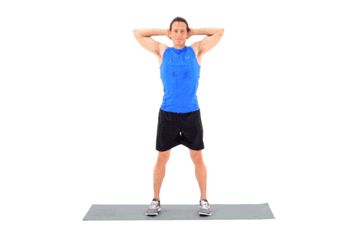 Debout, les jambes tendues et les genoux relevés, levez les mains vers l'avant et vers le haut, paumes vers l'avant, regardez devant vous. Ensuite, appuyez les deux paumes sur la poitrine, paumes vers le bas, bouts des doigts tournés l'un vers l'autre, regardez droit devant vous. Les deux paumes et les doigts sont insérés sous les aisselles vers l'arrière, en regardant droit devant.