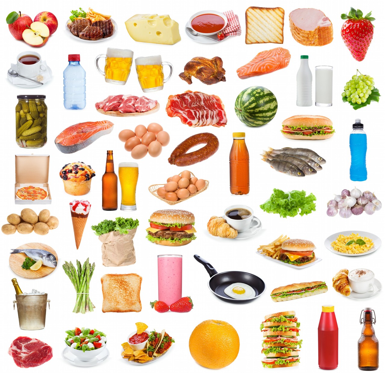 Aliments frais tels que le blé, les germes de haricots mungo, le chou chinois, les épinards, l'amarante, les champignons enoki, le concombre, la courge amère, le chou, le muguet, l'oie, le couteau, les palourdes, l'anguille, la carpe, le nori, le varech, le pomelo, les oranges, la noix de coco, le cantaloup, le fruit du dragon et l'asperge.