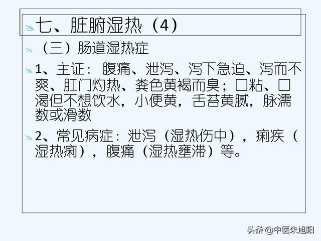 La stagnation de l'humidité et de la chaleur dans le gros intestin provoque des douleurs abdominales, des douleurs aiguës et sévères, une dysenterie avec du pus et du sang, des brûlures à l'anus, des urines courtes et rougeâtres, une langue rouge et des mousses jaunâtres et graisseuses. L'humidité et la chaleur stagnent dans les intestins, obstruant le qi et le sang et provoquant des troubles de la conductivité, ce qui entraîne des douleurs abdominales et une lourdeur aiguë et subséquente ; l'humidité et la chaleur blessent le qi et le sang, les transformant en pus et en sang, d'où la diarrhée ; la mousse grasse correspond à l'humidité, et la mousse jaunâtre à la chaleur. La dysenterie et d'autres maladies peuvent être observées dans les manifestations cliniques ci-dessus.