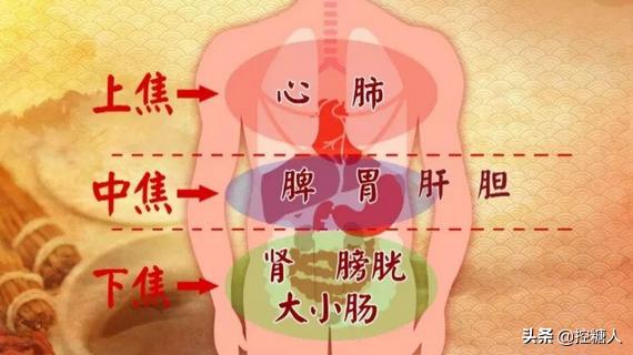 En médecine chinoise, le corps humain est divisé en trois jiao : le jiao supérieur, le jiao moyen et le jiao inférieur. Le jiao supérieur correspond principalement au cœur et aux poumons, le jiao moyen à la rate et à l'estomac, et le jiao inférieur aux reins, à la vessie, au gros intestin et à l'intestin grêle, etc.