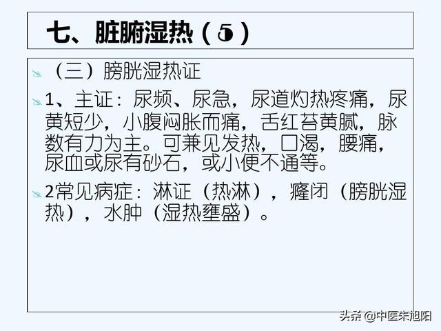 La vessie est le siège des fluides, l'humidité et la chaleur sont intégrées dans le Jiao inférieur et injectées dans la vessie, et l'humidité et la chaleur bloquent les reins et la vessie, ce qui entraîne un trouble du qi et de la transformation des reins et de la vessie, qui se manifeste par un écoulement d'eau, une miction défavorable, une douleur astringente lors des fuites, une rougeur de l'urine, une turbidité de l'urine, une fréquence des mictions et une dysurie (c'est-à-dire des symptômes d'irritation des voies urinaires tels que la fréquence des mictions, l'urgence mictionnelle, la brièveté des mictions et la douleur lors des mictions).