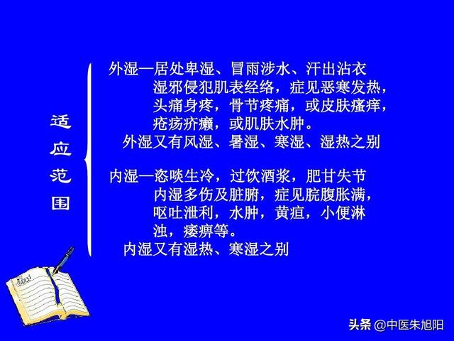 - L'humidité endogène ou exogène provoque la manifestation d'un dysfonctionnement de la rate et de l'estomac. L'humidité endogène provient de la faiblesse de la rate et de l'estomac ; il s'agit principalement d'une pathogenèse chronique à long terme, avec une distension abdominale et des selles molles, une aggravation après les repas, une faiblesse des membres, un gonflement et une obésité du corps, une langue pâle recouverte d'une couche de graisse blanche et un pouls faible. La stagnation de l'humidité externe est principalement une maladie épisodique aiguë, après avoir ressenti l'humidité, la rate et l'estomac sont obstrués par l'humidité et l'élévation est désordonnée, ce qui se traduit par des nausées et des vomissements soudains, des douleurs et une somnolence dans le corps, une confusion, une diarrhée, et l'humidité en surface peut se manifester par de la fièvre sans transpiration, avec une langue pâle, un enduit blanc, et un pouls flottant et glissant.