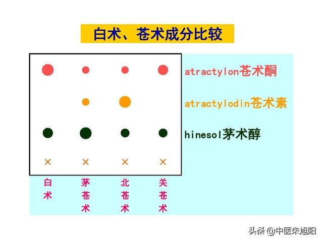 L'atractylode macrocephala et l'atractylode cangzhu peuvent assécher l'humidité et renforcer la rate, ont un goût chaud et amer et sont attribués au méridien de la rate et de l'estomac. Ils sont utilisés pour le traitement de la diarrhée ou des selles molles dues à la déficience de la rate et à l'humidité, et pour faire baisser la tension. Cependant, l'atractylodes macrocephala et le doux, pour compléter la déficience pendant longtemps, en plus de la bonne rate, mais aussi pour reconstituer le qi, le fœtus, arrêter la transpiration, mais aussi l'eau, l'œdème, le flegme ; l'atractylodes macrocephala et le piquant, afin d'éliminer le mal pendant longtemps, en plus de la bonne humidité séchante, mais aussi pour se débarrasser de l'humidité du vent, publié, mais aussi pour éclaircir les yeux, le traitement de la cécité nocturne, avec l'amer et le froid (ginseng amer, cyprès) pour traiter les plaies de l'humidité-chaleur, la mycose des pieds.