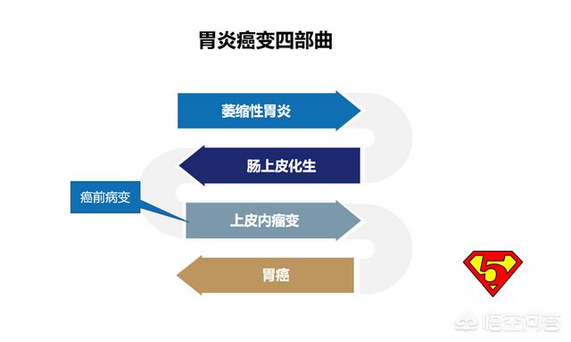 Tout d'abord, je voudrais vous annoncer une bonne nouvelle : dans le dernier consensus d'experts sur les stratégies de prise en charge des états précancéreux et des lésions précancéreuses de la muqueuse gastrique en Chine, les experts considèrent la gastrite atrophique et la métaplasie intestinale comme des états précancéreux, mais pas comme des lésions précancéreuses, et la différence entre les deux mots a un grand impact. Dans le nouveau système de consensus, la gastrite atrophique et la métaplasie intestinale sont des états précancéreux, et la néoplasie intraépithéliale de la muqueuse gastrique est une lésion précancéreuse. On peut comprendre que cet état précancéreux est plus léger qu'une lésion précancéreuse, et que le temps nécessaire à l'évolution d'un état précancéreux en lésion précancéreuse jusqu'au cancer gastrique semble plus long. Par conséquent, certains des patients qui soupirent à cause de la gastrite atrophique et de la chimiose intestinale peuvent pousser un petit soupir de soulagement, mais nous devons encore prêter attention aux changements de l'état.
