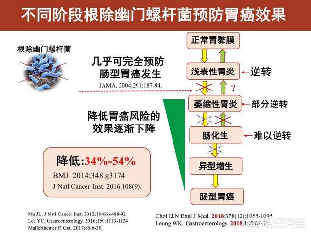 La présence d'Helicobacter pylori est responsable du développement de la gastrite atrophique, de l'intestinalisation en néoplasie intraépithéliale ou même du cancer. Selon le consensus, l'éradication d'H. pylori avant le développement d'une gastrite superficielle en gastrite atrophique peut pratiquement empêcher l'apparition d'un cancer gastrique de type intestinal. L'éradication en temps opportun après le développement d'une gastrite atrophique réduit également les risques de cancer de près de 50 %, d'où l'importance d'une éradication en temps opportun.