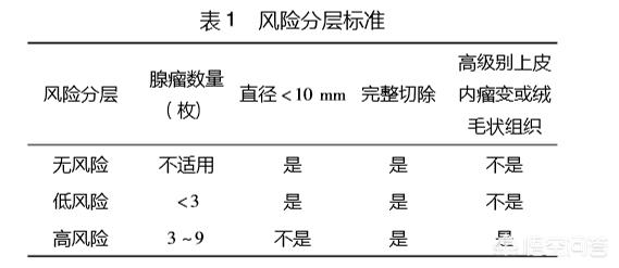 Groupe à haut risque : polypes adénomateux dont le diamètre est supérieur à 1 cm, dont le nombre est supérieur à 3 ou dont les résultats pathologiques montrent une néoplasie intraépithéliale de haut grade.