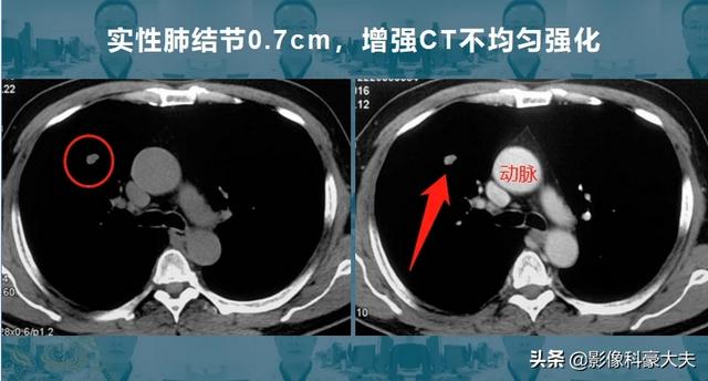 Il s'agissait d'un nodule pulmonaire solide de 7 mm (cas partagé par le professeur Huang de l'hôpital de cancérologie de Shandong), irrégulier, avec un rehaussement inégal sur la tomodensitométrie améliorée, et la pathologie chirurgicale était un adénocarcinome pulmonaire invasif sans métastase.