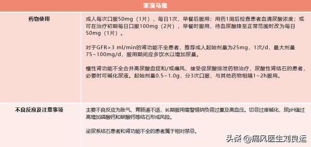 - Benzbromarone :La benzbromarone convient aux patients dont l'excrétion d'acide urique est réduite, mais avant d'utiliser ces médicaments pour déterminer la quantité d'excrétion urinaire d'acide urique, si l'excrétion urinaire d'acide urique sur 24 heures du patient est > 3,54 mmol ou si des calculs urinaires sont interdits, l'insuffisance rénale en particulier doit être utilisée avec précaution. En outre, la benzbromarone ayant tendance à augmenter le risque de calculs urinaires, l'utilisation de ces médicaments doit être basée sur la valeur du pH urinaire de l'alcalinisation appropriée de l'urine.