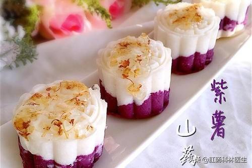 4) Rouler la purée d'igname et de pommes de terre violettes en boules de 3:1, placer les boules dans les moules à gâteau de lune, les presser fermement et les démouler pour les servir.