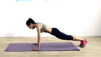 4, toujours en inspirant, les jambes sautent vers l'arrière et se rejoignent.