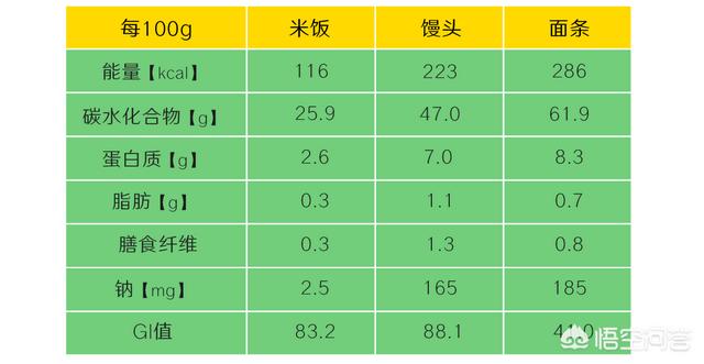 Comme le montre le tableau, pour une même portion de 100 g, c'est le riz qui contient le moins d'énergie, les petits pains à la vapeur sont presque deux fois plus énergétiques que le riz, tandis que l'énergie des nouilles est un peu plus de deux fois supérieure à celle du riz. Donc, en fait, manger du riz plutôt que de manger la même portion de petits pains à la vapeur et de nouilles apporte moins d'énergie.