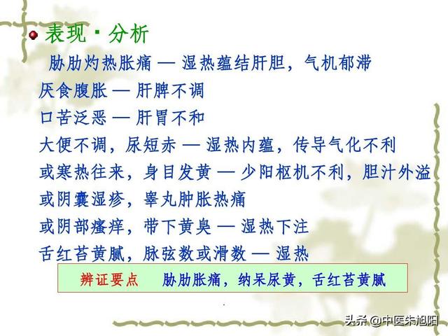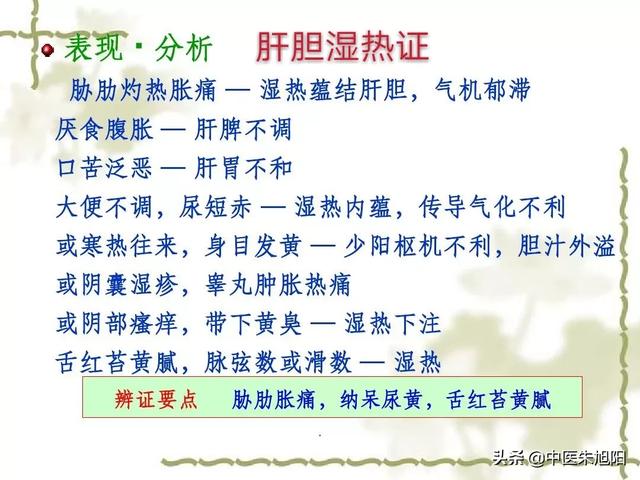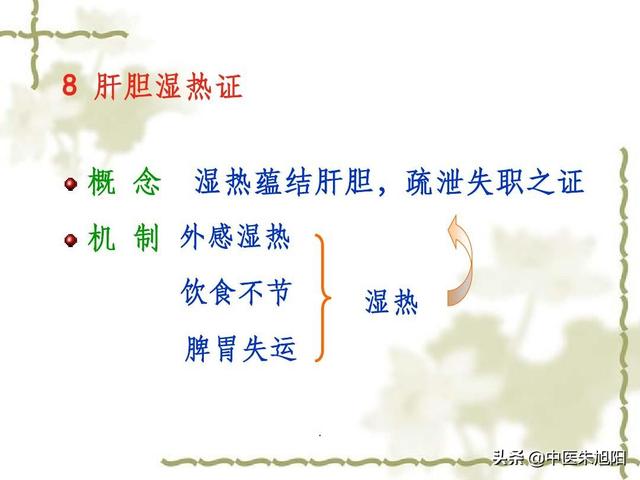 Humidité et chaleur du foie et de la vésicule biliaire, principalement dues au mélange d'humidité et de chaleur dans le corps, associées à l'alcoolisme de longue durée, à la surconsommation de viande grasse, entraînant une humidité et une chaleur plus graves, la fonction d'excrétion du foie et de la vésicule biliaire diminuant, la formation d'humidité et de chaleur du foie et de la vésicule biliaire, les principales manifestations : vertiges et maux de tête, distension et douleur de la poitrine et de l'hypocondre, bouche amère et sécheresse des yeux, insomnie, urine jaune, selles, agitation.