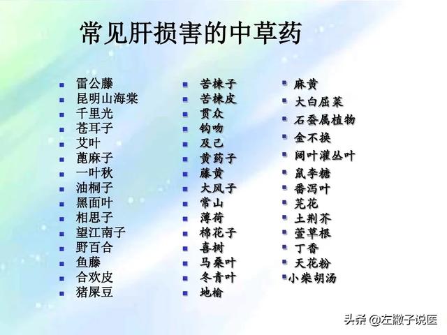 6. la médecine chinoise peut aussi endommager le foie ! Beaucoup de gens disent que les instructions de la médecine occidentale énumèrent divers effets secondaires sur une feuille dense, ou que la médecine chinoise est bonne, sans aucun effet secondaire. Mais en fait, ce n'est pas le cas, beaucoup de médicaments chinois sont efficaces pour sauver des vies, alors que d'autres ne sont pas efficaces pour les "tuer". Lei Gongteng, Pu Huang, gingembre, poudre de palourde divertissante, Huang Duo, He Shouwu, rhubarbe, Ze Xie Di, herbes jaunes, Cang Er Zi, fruits blancs, demi-sommiers, neem, coriandre, etc.