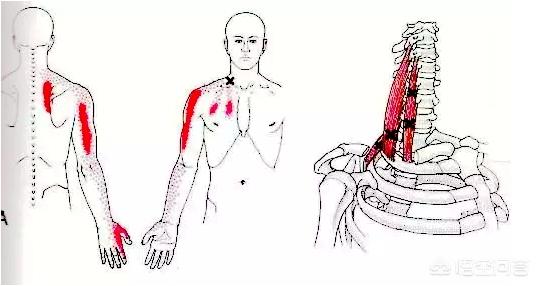 L'hypertrophie et le spasme des faisceaux moyens et antérieurs des obliques peuvent entraîner le piégeage des nerfs du plexus brachial qui les traversent, ce qui peut provoquer des douleurs irradiantes et des engourdissements dans l'épaule, le dos et les extrémités supérieures ; ce traitement de la sensibilité musculaire localisée ne fonctionne pas, et il est nécessaire de supprimer le piégeage des nerfs du plexus brachial.