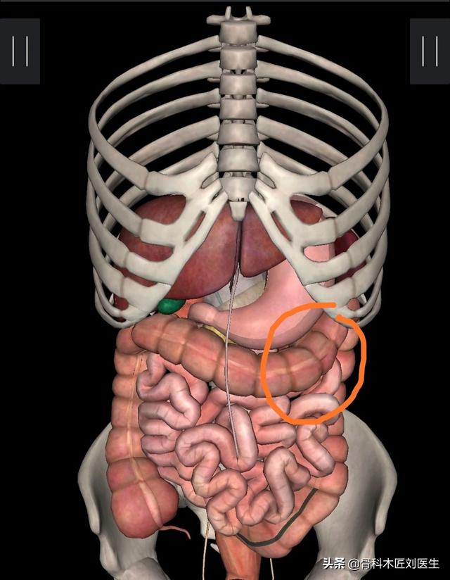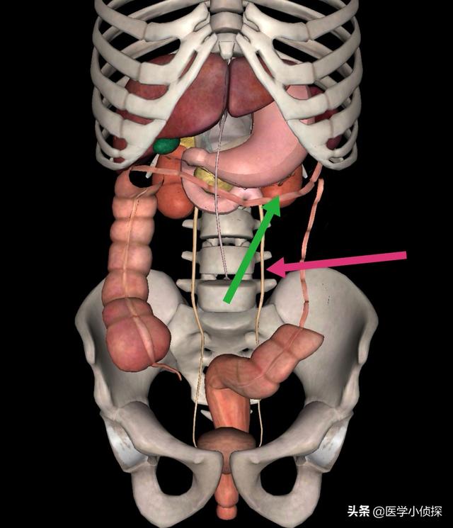 Mais la structure de notre corps humain est loin de l'imagination de chacun, loin d'être simple, si l'on regarde à la surface, il n'y a que le gros intestin et l'intestin grêle.En s'éloignant du gros intestin et de l'intestin grêle, on trouve derrière eux les reins (indiqués par les flèches vertes) ainsi que les uretères (indiqués par les flèches rouges), comme le montre le schéma ci-dessous :