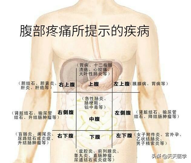 Les symptômes de la douleur abdominale sont liés aux lésions des organes de la cavité abdominale. L'abdomen est généralement divisé en neuf régions lors de la localisation et du diagnostic de la douleur abdominale, de sorte que le diagnostic initial de la maladie à l'origine de la douleur abdominale peut être établi en fonction de la localisation de la douleur, de sa nature, des symptômes qui l'accompagnent et des signes physiques.