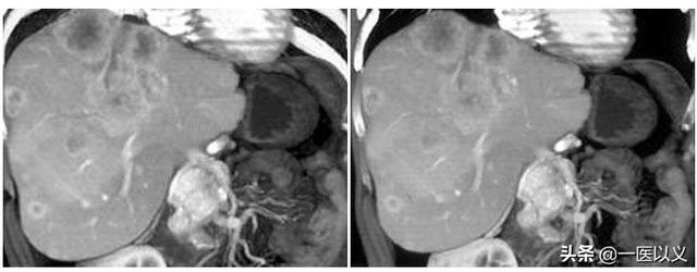 L'image ci-dessus est une image tomodensitométrique d'un hémangiome hépatique avec une ombre de faible densité dans le lobe droit avec des bords clairs et un rehaussement progressif du bord vers le centre après le rehaussement.
