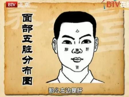 Le chapitre Su Wen - Chaleur lancinante dit : "La joue gauche rougit en premier en cas de chaleur du foie, le visage en premier en cas de chaleur du cœur, le nez en premier en cas de chaleur de la rate, la joue droite en premier en cas de chaleur du poumon, la joue en premier en cas de chaleur des reins et le menton en premier en cas de chaleur des reins". (Figure 1 ci-dessous)