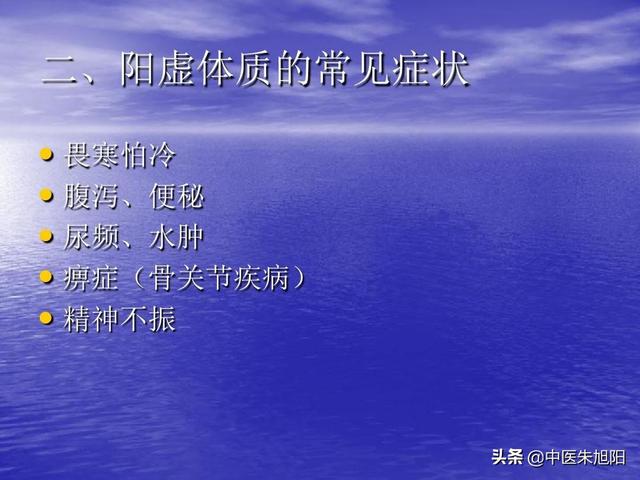 - La carence en yang se réfère à la carence en yang qi, la fonction de réchauffement et de stimulation de la promotion des activités vitales du corps a diminué, les manifestations pathologiques du froid interne est principalement, le symptôme typique est les mains et les pieds ne sont pas chauds, les mains et les pieds froids, et la carence en yin de la base typique de la manifestation est le contraire, la carence en yang ont souvent un rythme cardiaque lent, la fatigue, l'essoufflement, la miction fréquente et les selles molles, comme la capacité de réchauffer le problème affaibli.