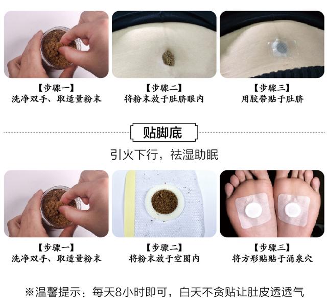 Utilisation :Pilez les trois, mettez-les dans le nombril avant d'aller vous coucher, collez-les avec du ruban adhésif respirant, et découvrez-les le lendemain matin (sinon ils seront faciles à enflammer). Vous pouvez en faire plusieurs à la fois, certaines personnes réagissent rapidement, quelques fois il y a un sens clair, certaines personnes sont plus lentes, à utiliser deux ou trois semaines.