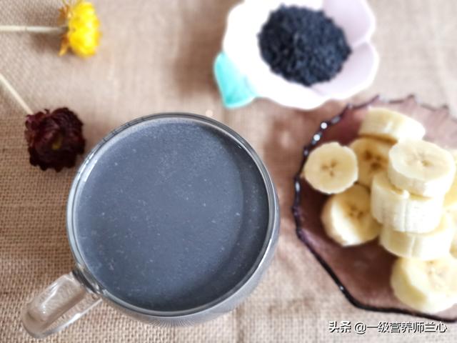 Pratique : épluchez la banane, coupez-la en petits morceaux et ajoutez les graines de sésame noir dans la machine à lait de soja, ajoutez de l'eau, choisissez le bouton "lait de soja".