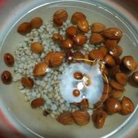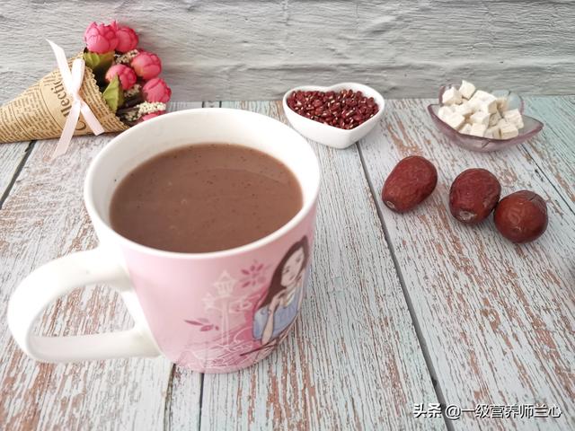 Pratique : haricots rouges, poria blanc trempés pendant plus de 2 heures ; jujube lavé, enlevé le noyau, déchiré. Tous les matériaux sont placés dans la machine à lait de soja ou dans le brise-muraille, ajouter de l'eau, choisir le bouton "lait de soja".