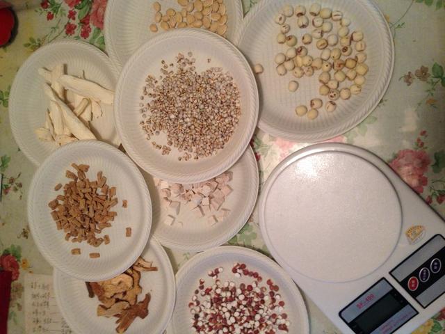 30 g de lentilles blanches (en cas de selles sèches ou de constipation, utilisez plutôt des amandes), 30 g d'Atractylodes macrocephala, 50 g de Poria, 50 g de Coix lacryma, 50 g de chair de graines de lotus, 50 g de fruits de gorgone, 50 g de Radix et Rhizoma Ginseng, 60 g d'igname chinoise, 60 g de poudre de racine de lotus, 100 g de farine de riz glutineux, 300 g de farine de riz, et une quantité appropriée de sucre blanc.
