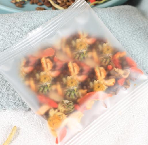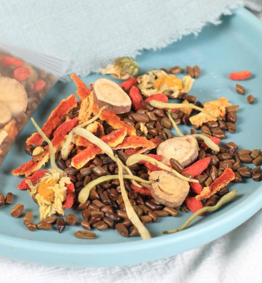 chrysanthèmeIl élimine la chaleur et le feu, nettoie le foie et désintoxique les toxines ;chèvrefeuilleIl dégage la chaleur et élimine les toxines, refroidit le sang et résout les blocages ;écorce d'orangeIl régule le Qi et élimine les aliments, renforce la rate et nourrit l'estomac ;(botanique) graine de casseIl protège le foie et améliore la vue, il est laxatif et nettoie les intestins ;baie de gojiIl est utilisé pour protéger le foie et améliorer la vue, soulager la fièvre et la sédation ;réglisseIl élimine la chaleur et les toxines, tonifie la rate et favorise le Qi.