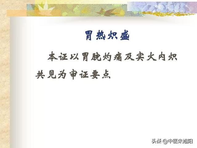 - Analyse des symptômes :Le feu de l'estomac brûle dans l'estomac, donc l'estomac brûle ; le feu de l'estomac brûle le liquide yin de l'estomac, donc la soif, la chaleur dans l'estomac, comme les boissons fraîches se sentent à l'aise ; le feu de l'estomac, la putréfaction de l'eau et des grains plus rapide, c'est-à-dire, la digestion est rapide, facile à la faim.