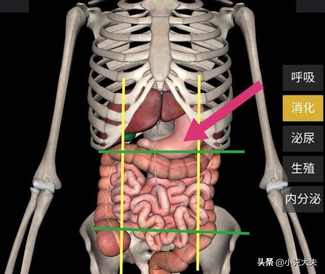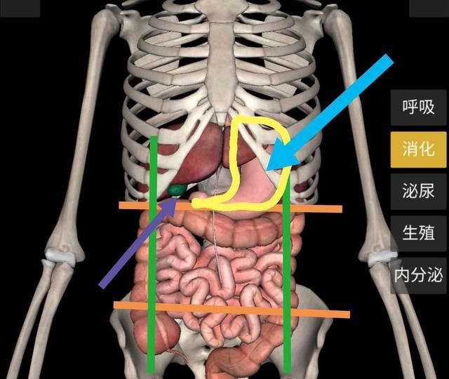 La flèche rouge pointe vers notre estomac.La majeure partie de l'estomac est située dans la partie supérieure de l'abdomen, et nous pouvons toucher la paroi antérieure de l'estomac en touchant d'abord le processus xiphoïde sur notre poitrine, puis vers le bas. Cependant, l'estomac est le plus grand organe digestif de notre système digestif et il est généralement divisé en quatre parties : le côté gauche du cardia au-dessus du plan de la partie gonflée du fond de l'estomac ; l'incision angulaire et le point le plus bas de la courbure de l'estomac au-dessous de la ligne appelée sinus gastrique ; et entre le sinus et le fond de l'estomac pour le corps gastrique ; l'annexe de 2,5 cm du cardia est appelée cardia, comme l'indique la figure ci-dessous :