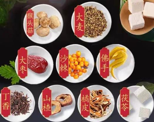 le cynorrhodon (fruit de l'aubépine)Renforcement de la rate et ouverture de l'estomac, élimination de la stagnation des aliments ;Wolfiporia extensa (un champignon de décomposition du bois)Tonifier la rate pour arrêter la diarrhée, harmoniser l'estomac et réguler le Qi ;écorce d'orangeRégulation du Qi, renforcement de la rate, assèchement de l'humidité et élimination des mucosités.