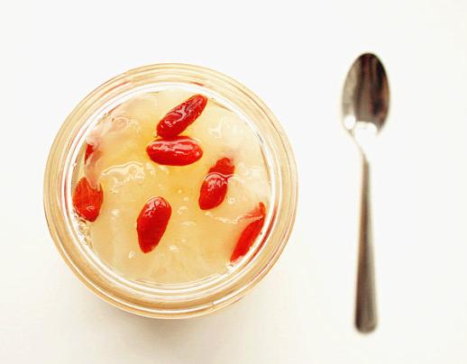 15 grammes de champignons d'argent, 25 grammes de baies de loup. Mettre les champignons d'argent et les baies de loup dans une casserole, ajouter la bonne quantité d'eau et, sur le feu, obtenir un jus épais, ajouter du miel, puis faire frire pendant 5 minutes. Tous les deux jours, servir de l'eau chaude. Cette soupe de désintoxication et de soin de la peau nourrit le Yin et tonifie les reins, favorise les gaz et le sang, humidifie la peau et a un bon effet colorant.