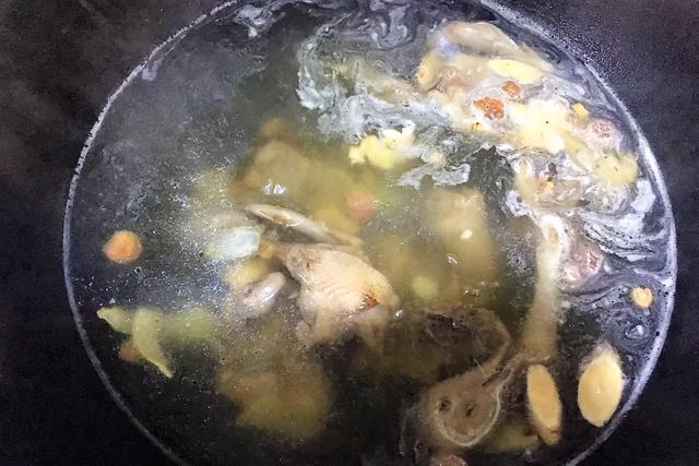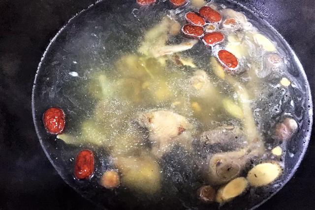 Méthodes : Poulet abattu, propre et coupé en morceaux, puis "eau volante" ; matériaux lavés et épargnés ; puis tous les matériaux dans le faitout, ajouter environ 5 bols d'eau bouillie froide, laisser mijoter pendant 2 heures et ajouter du sel.