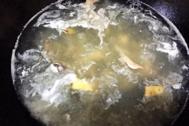 3. Les ingrédients ci-dessus et le gingembre sont ajoutés à dix bols d'eau, à feu vif, à feu moyen, puis cuire pendant environ deux heures, et enfin ajouter le sel approprié pour l'assaisonnement.